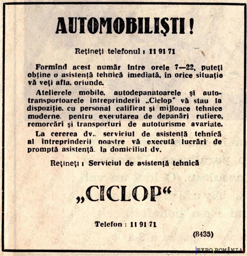 Atelierele mobile, autodepanatoarele şi auto-transportoarele întreprinderii „Ciclop” vă stau la dispoziţie, cu personal calificat şi mijloace tehnice moderne, pentru executarea de depanări rutiere, remorci şi transporturi de autouri avariate.