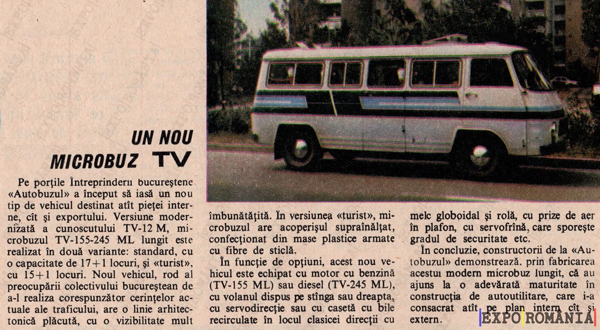 Pe porțile Întreprinderii bucureștene „Autobuzul” a început să iasă un nou tip de vehicul destinat atât pieței interne, cât și exportului. Versiunea modernizată a consituţiei TV-12 M, coborul TV-155-245 ML lungă est realizat în două variante: standard, cu o capacitate de 17+1 locuri, turistă 15+1 locuri. Noul vehicul, rod al reapărării cooperativului bucureștean ale traficului, are o linie arhitectonică plăcută, cu o vizibilitate mult