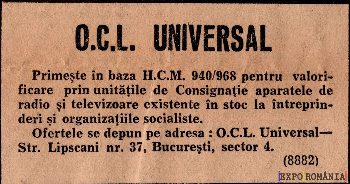 Primește în baza H.C.M. 940/968 pentru valorificare prin unitățile de Consignație aparatele de radio și televizoare existente în stoc la întreprinderi și organizațiile socialiste.