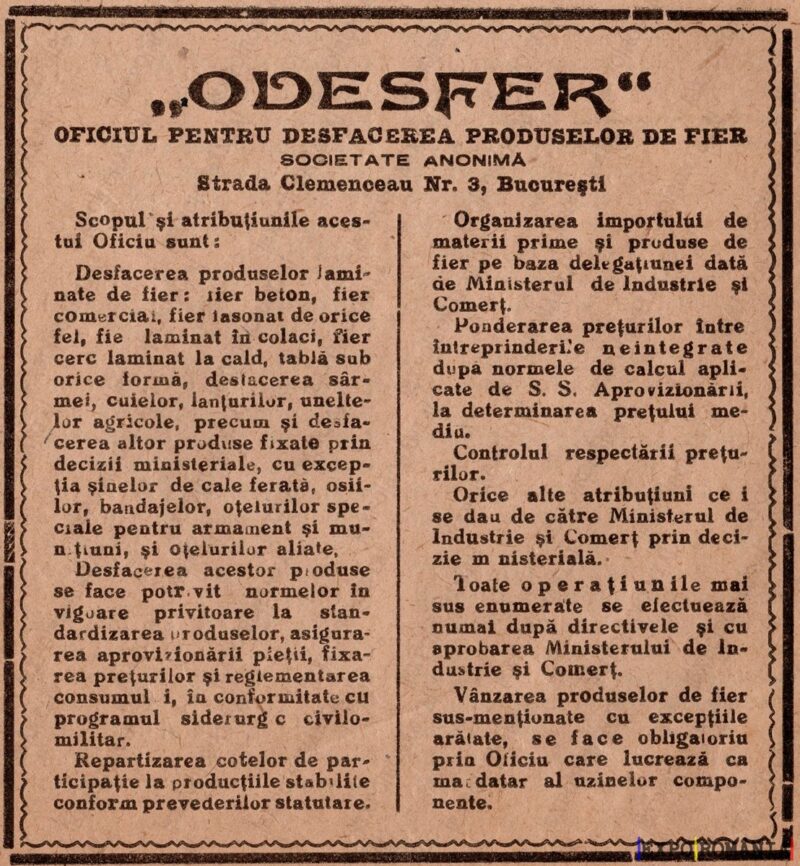 Organizarea importului de materii prime și produse de fier pe baza delegațiunii date de Ministerul de Industrie și Comerț.