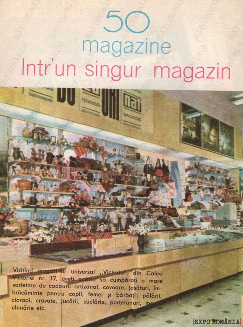Vizitați magazinul universal „Victoria” din Calea victoriei nr. 17, unde veți cumpăra o mare varietate de cadouri artistice, covoare, textile, îmbrăcăminte pentru copii, femei și bărbați, pălării, ciorapi, cravate, lucruri, sticle, porțelanuri, etc.