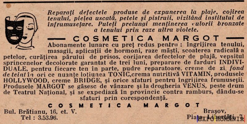 Abonamente lunare cu preț redus pentru: îngrijirea tenului, masaje, aplicații de hormoni, raze măști, scoaterea radicală a petelor, curățarea părului de produse, corectarea defectelor de plajă, vă sprijină în alegerea decolației garantat de tenul lin, parcare de rânduri INDIVIDUALE, pentru fiecare ten în parte, produse reparatoare, creme de zi, fond de teint și onor noua loțiune TONIC, crema nutriitivă VITAMIN, PRODUS HOLLYWOOD, crema BRIDGE, și orice sfaturi pentru îngrijirea frumuseții. Produsele MARGOT se găsesc și la drogăria VENUS, peste drum de Teatrul Național, și se expediatează în provincie contra ramburs, dându-se sfaturi prin corespondență.