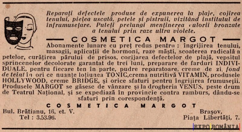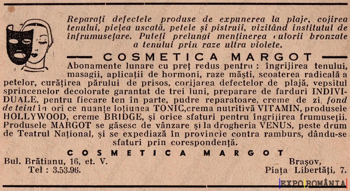 Abonamente lunare cu preț redus pentru: îngrijirea tenului, masaj, aplicatii de hormoni, raze măști, scoaterea radicală a petelor, curățarea părului de prisos, corectarea defectelor de pielii, veștile sprincenelor decorate garantat de trei luni, preparare de produse INDIVIDUALE, pentru fiecare ten în parte, produse reparatoare, creme de zi, creme de noapte, tonice, creme nutritive VITAMIN, PRODUSE MARGOT se găsesc de vânzare la biroul de frumusețe VENUS, peste drum de Teatrul Național, și se expediază în provincie contra ramurii, dându-se statului prin corespondență.