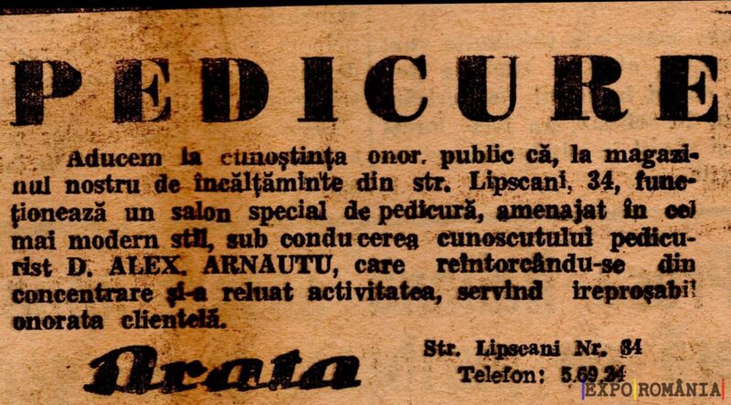 Adducem la cunoștința onor. public că, la magazinul nostru de încălțăminte din str. Lipscani, 34, funcționează un salon special de pedicură, amenajat în cel mai modern stil, sub conducerea cunoscutului pedicurist D. ALEX. ARNAȚU, care reîntorcându-se din concentrare, va relua activitatea, servind ireproșabil onorata clientelă.