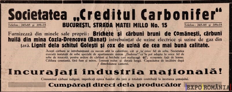 Furnizează din minele sale proprii: Brichete și cărbuni bruni de Comănești, cărbuni huilă din mina Cozla-Drenovca (Banat) extracte de uzine electrice și uzine de gaz din țară. Lignit detașat de șantier Golești și cox de uzină de cea mai bună calitate.