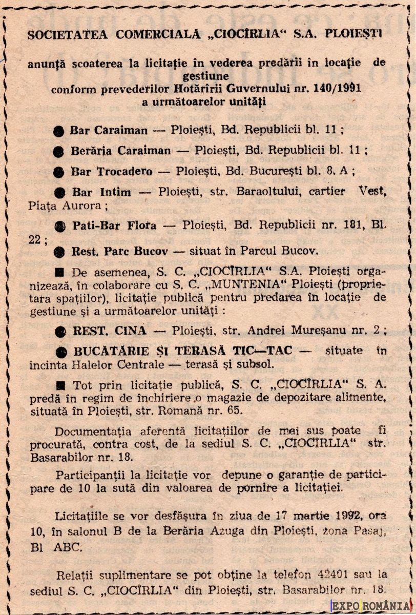 • De asemenea, S.C. „CIOCRLIA” S.A. Ploiești organizează, în colaborare cu S.C. „MUNTENIA” Ploiești (org. comercial), o licitație publică privederă în taverne: