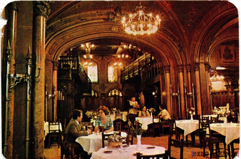 Restaurant interior with intricate architecture.