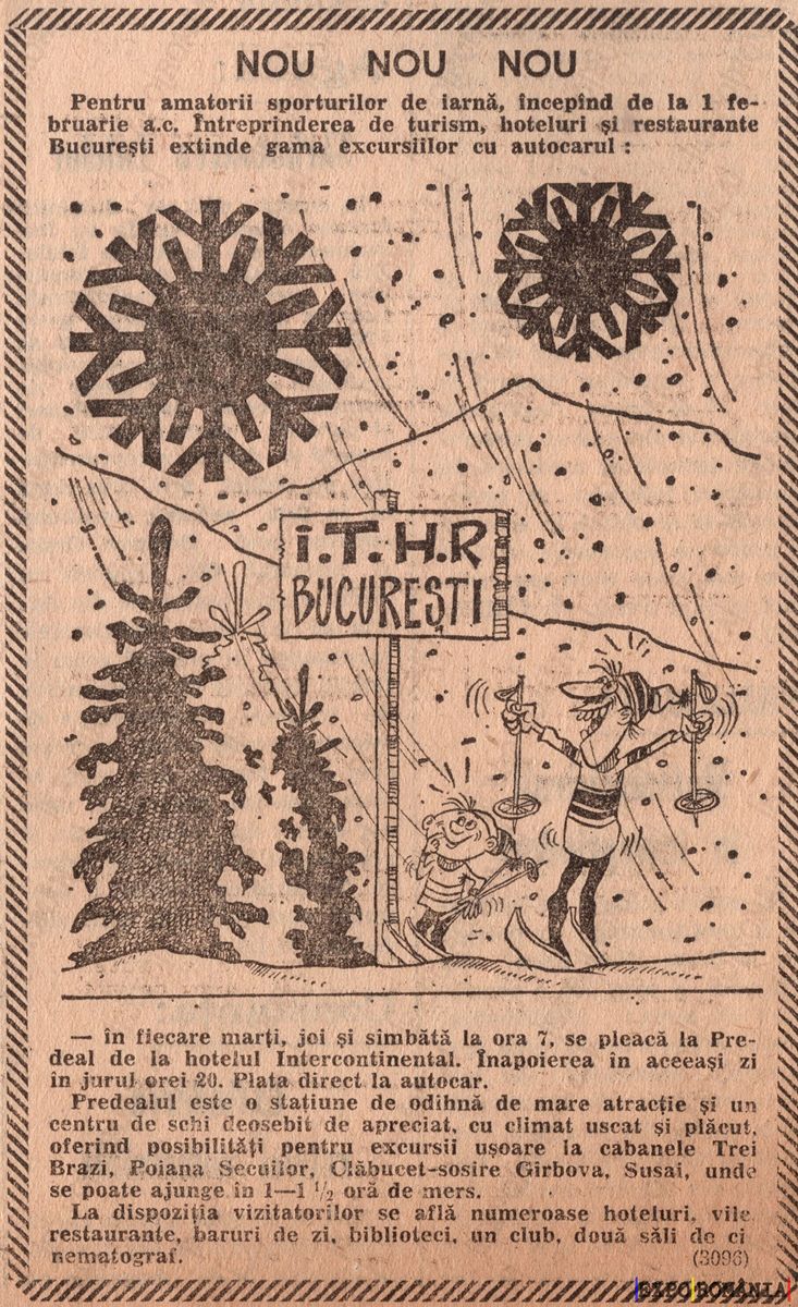 În fiecare marți, joi și sâmbătă la ora 7, se pleacă la Predeal de la hotelul Internațional. Împrejurările în acest preț sunt: 20 lei, Plata direct la ghid.