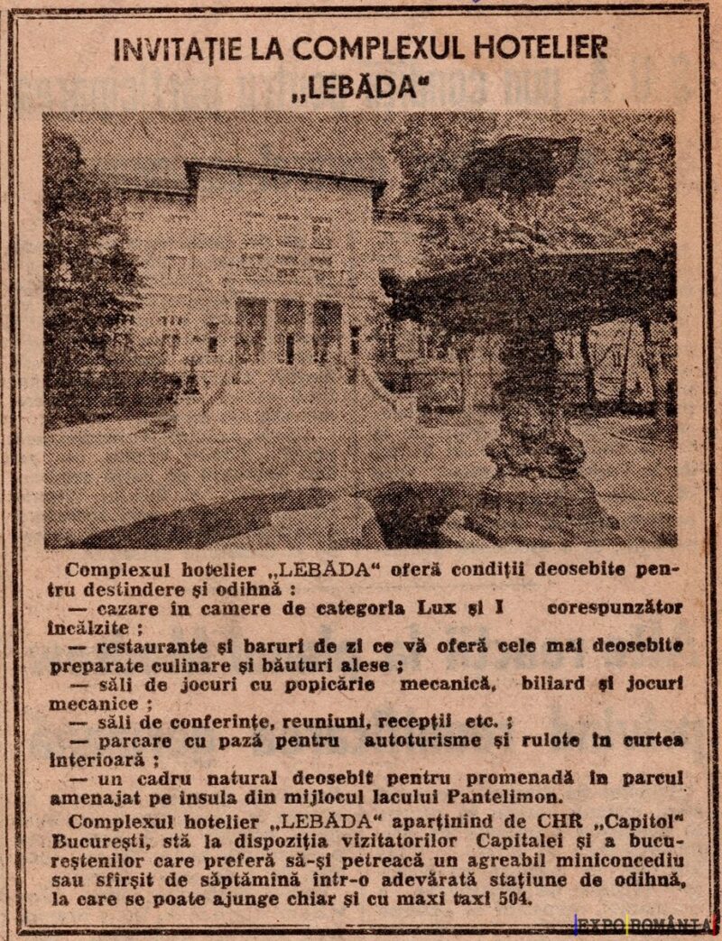 Complexul „LEBĂDA” aparținând de municipiul „Capitol” București, este la dispoziția vizitatorilor Capitalei și se prezintă ca loc de odihnă și recreere, limită de cazări oferind chiar și max 504.