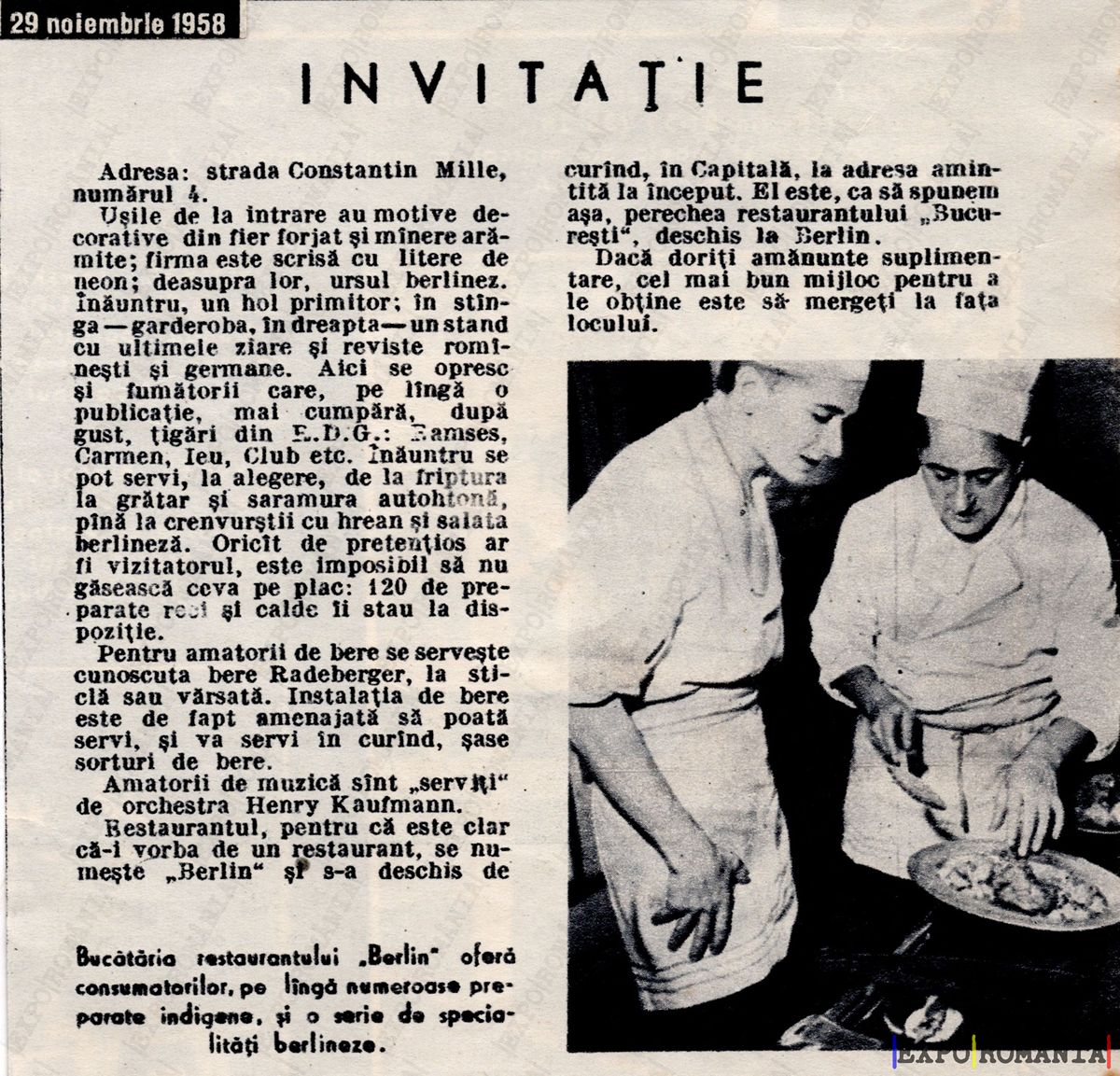 „Bucătăria restaurantului „Berlin” oferă combinații utile, în fiecare comision, pentru toate gusturile.”
