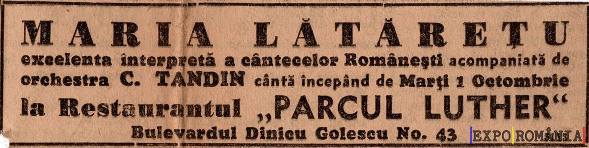 excelenta intérpretă a cântecelor Românești acompaniatã de orchestra C. TANDIN cântã începutnd de Marți 1 Octombrie
