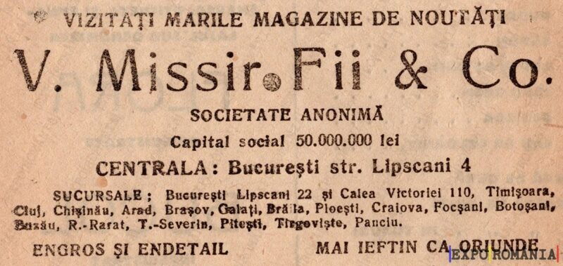 SUCURSALE: București Lipscani 22 & Calea Victoriei 110, Timișoara, Cluj, Chisinău, Arad, Brașov, Galați, Brăila, Ploiești, Craiova, Focșani, Botoșani, Bârlad, R. Rărat, T. Severin, Pitești, Târguviște, Panciu.
