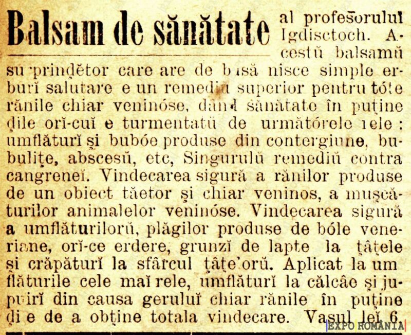 A-cestui balsami su-prănditor care are de bas nite simple er-buri salutare e un remediu superior pentru tote rănile chiar veninose, dând sănătate în pu tine ori-cui turmenta de următoarele tele: umflături şi buboe produse din contagiune, bulbite, abscese, etc, Singurul remedy contra cangerinei.