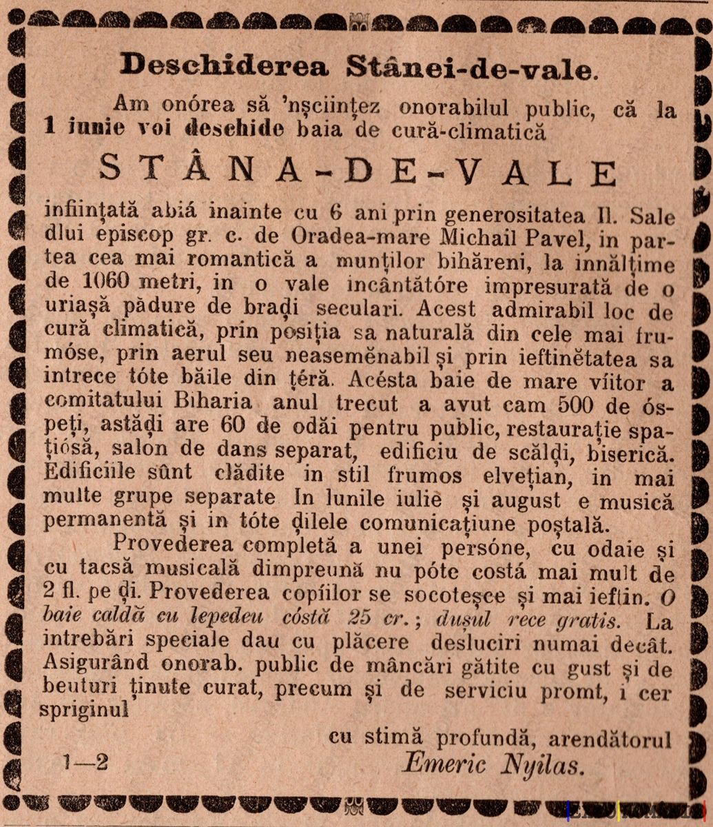 infinita abia înainte cu 6 ani prin generozitatea II. Sale dlui episcop pr. c. de Oradea-mare Mihail Pavel, în parte cea mai romantică a minunilor bihorene, la înălțimea de 1060 metri, în o vale încântătoare împresurată de o uriașă pădure de brad secular. Acest loc minunat, curat climatic, fiind poziția sa naturală din cele mai întru- muncitorile bârle din țară. Aceasta baia de mare viitor a constituțiunii, având un ușor trecut a avut 500 de pacienți, astăzi are 60 de odăi pentru public, restaurante spa- ciate în cele mai sănătoase și salubre clădiri, o clădire în stil rustic frumos, iar câte șaizei sau știi- uși. Însă, dar termina- că pe 1 iulie 1889.