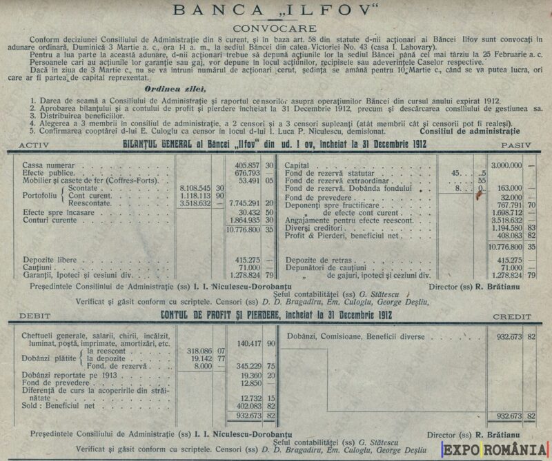 2. Aprobatul bilanțului general al Băncii „Jilfov” pentru anul încheiat la 31 Decembrie 1912.