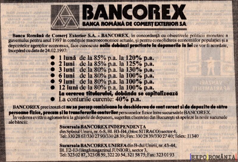 Banca Romană de Comerț Exterior S.A. – BANCOREX, în concordanță cu obiectivele politicii monetare a guvernului pentru anul 1997 în condițiile macroeconomice actuale, își pentru considerarea economiilor populare și depozitelor agenților economici, face cunoscută soldul deținatelor produse de depozitele în lei ce vor fi acordate, începând cu data de 24.02.1997:
