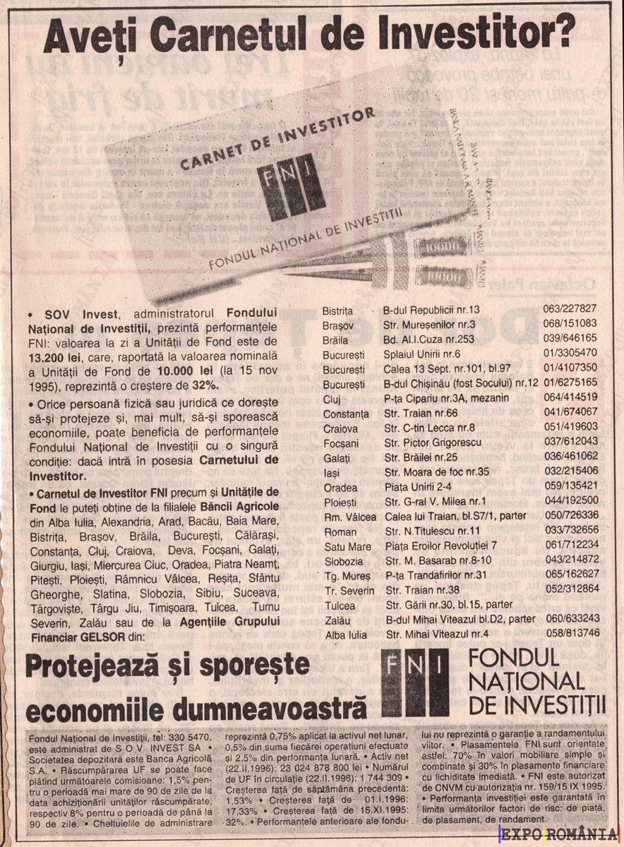 SOV Invest, administratorul Fondului Național de Investiții, prin acțiunile performante realizate în ultimii ani, vă oferă oportunitatea de a deveni investitor. Carnetul de Investitor FNI creează pentru dumneavoastră: