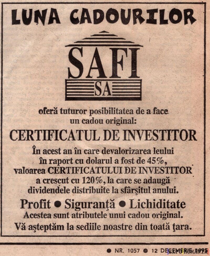 În acest an în care devalorizarea leului în raport cu dolarul a fost de 45%, valoarea CERTIFICATULUI DE INVESTITOR a crescut cu 120%, la care se adaugă dividende distribuite la sfârșitul anului.