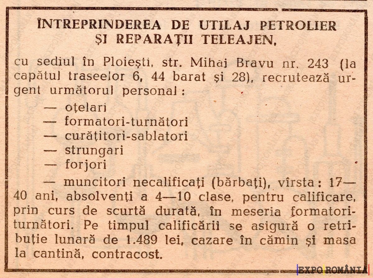 — muncitori necalificaţi (bărbaţi), vârsta: 17–40 ani, absolvenţi 4–10 clase, pentru calificare, prin curs de scurtă durată, în meseria formatorilor-turnători. Pe timpul calificării se asigură o retribuţie lunară de 1.489 lei, cazare în cămin şi masa la cantină, contractos.