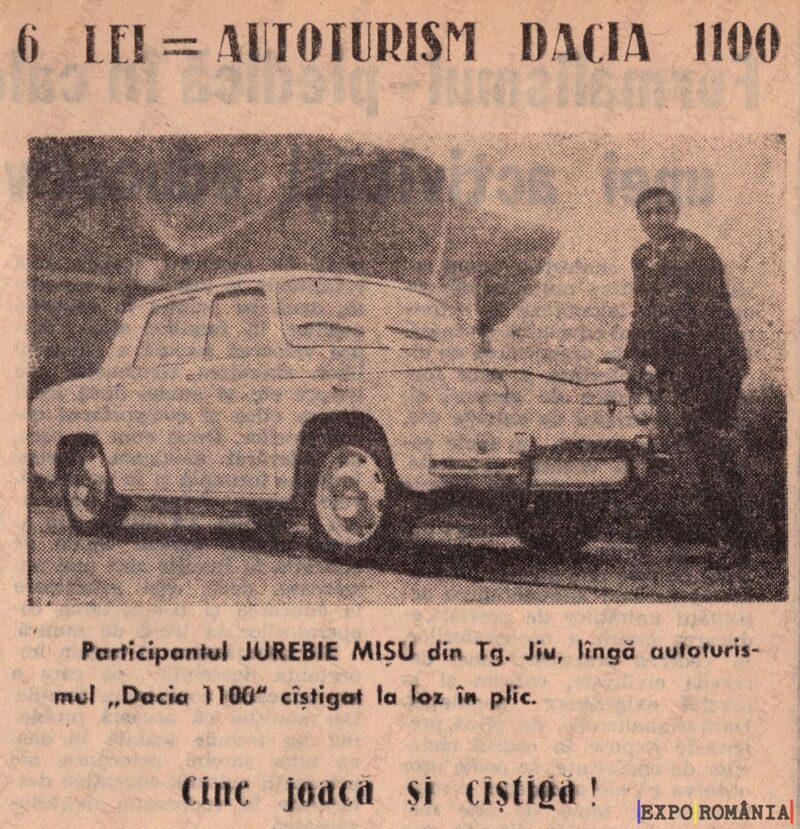 Participatul JUREBIE MISU din Tg. Jiu, lângă autoturismul „Dacia 1100” câștigat la loz în plic.
