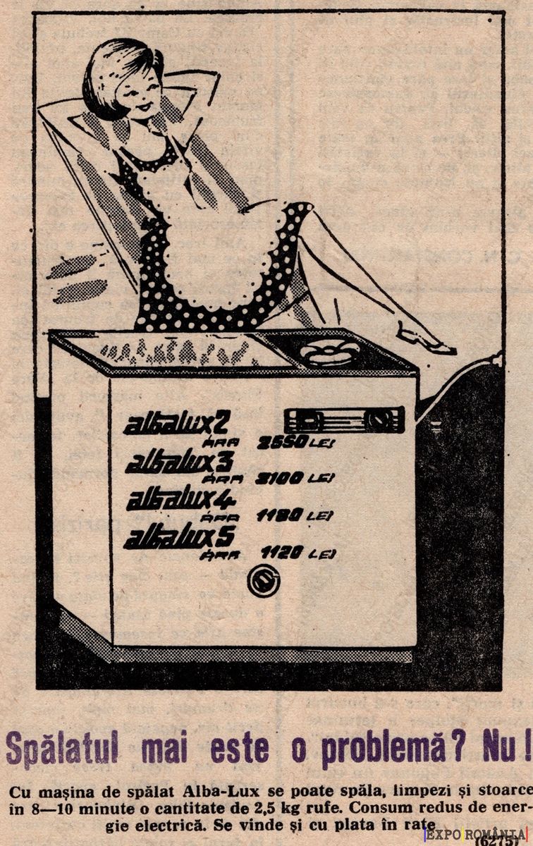 Cu mașina de spălat Alba-Lux se poate spăla, curăța și stoarce în 8—10 minute o cantitate de 2,5 kg rufe. Consum redus de energie electrică. Se vinde cu plata în rate.