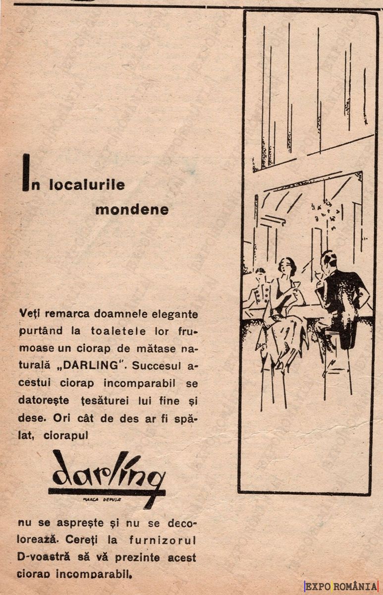 Veți remarca doamnele elegante purtând la toaletele lor frumoase un ciorap de mătase naturală „DARLING”. Succesul acestui ciorap incomparabil se datorește țesăturii lui fine și dese. Ori cât de des ar fi spălat, ciorapul
