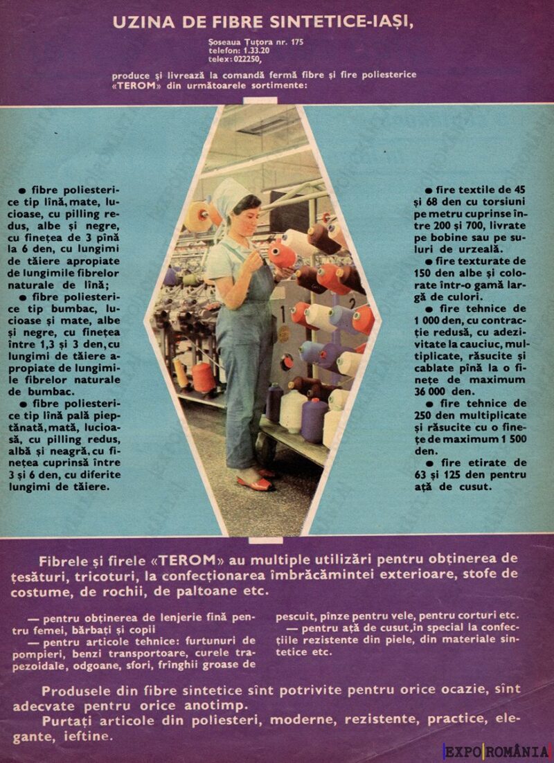 Fibrele și firele „TEROM” au multiple utilizări pentru obținerea de țesături, tricoturi, la confecționarea îmbrăcămintei exterioare, stofa de costume, de rochii, de paltoane etc.