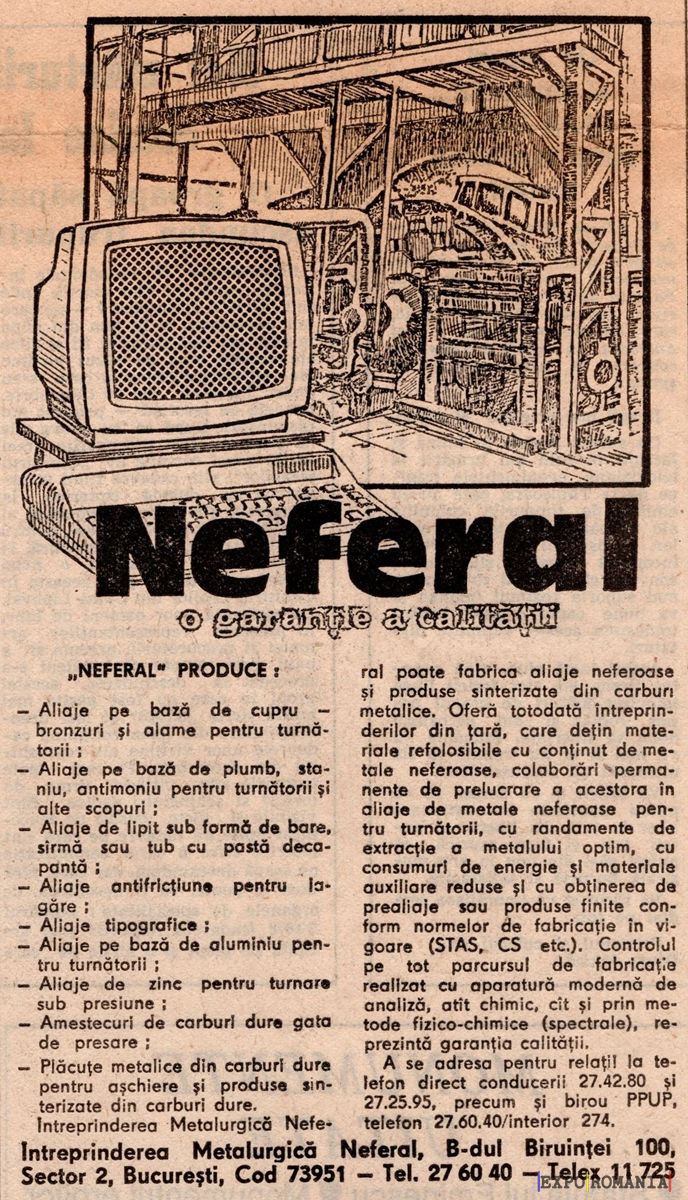 Interpretarea Metalurgiei Neferal, B-dul Biruntel 11 700, Sector 2, București, Cod 73951 – Tel. 27 60 40 – Telex 11 705