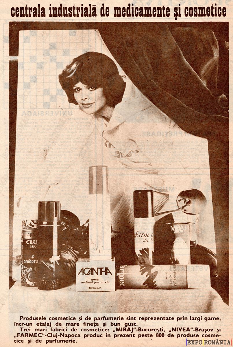 Trei mari fabrici de cosmetice: „MIRAJ” – București, „NIVEA” – Brașov și „FARMEC” – Cluj-Napoca produc în prezent peste 800 de produse cosmetice și de parfumuri.