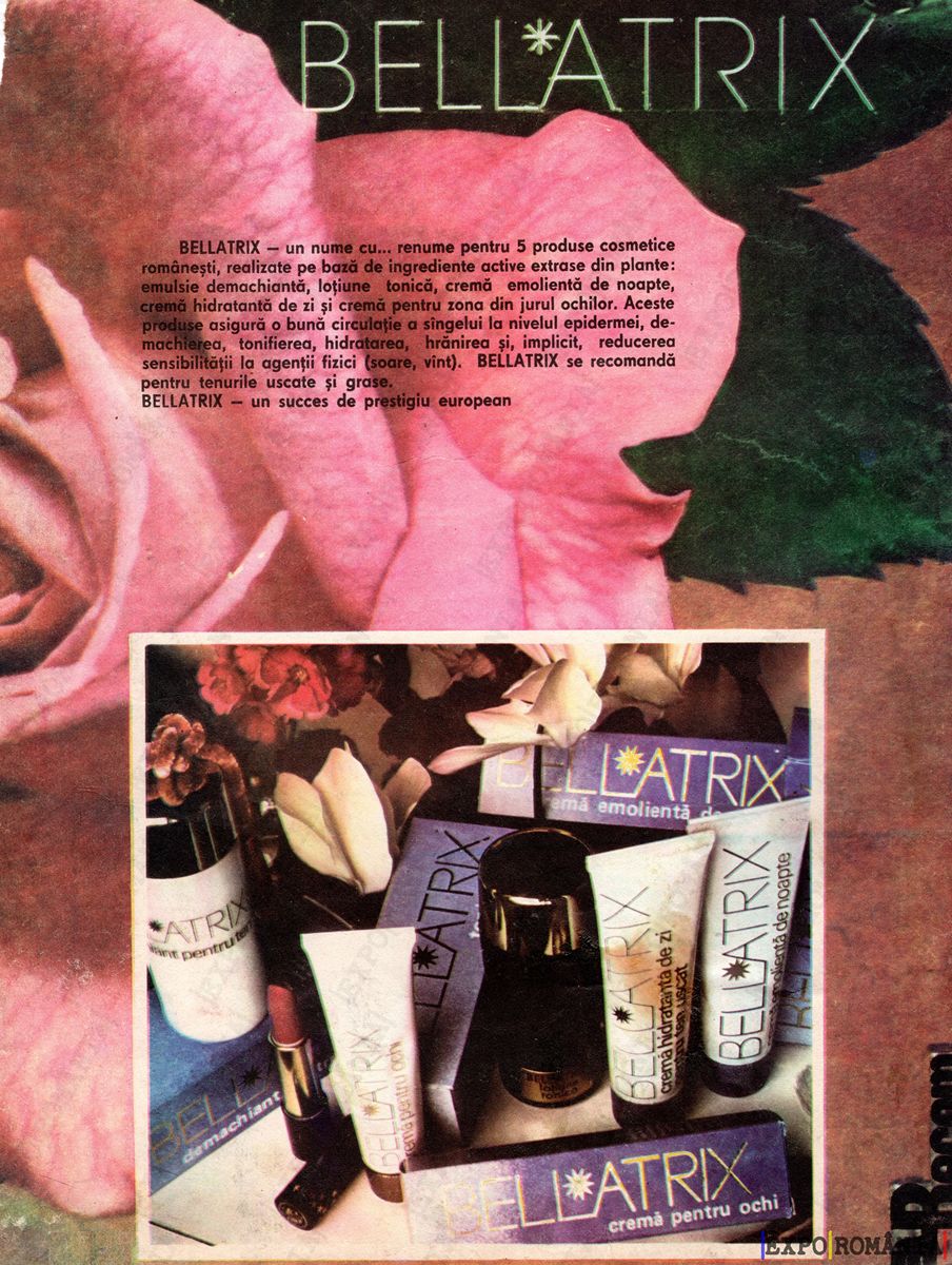 Produse dedicate, utile: buzelor, tenului, ochilor, părului, dând un rezultat visat în combaterea însușirilor negative ale vârstei. BELLATRIX se recomandă cu încredere.