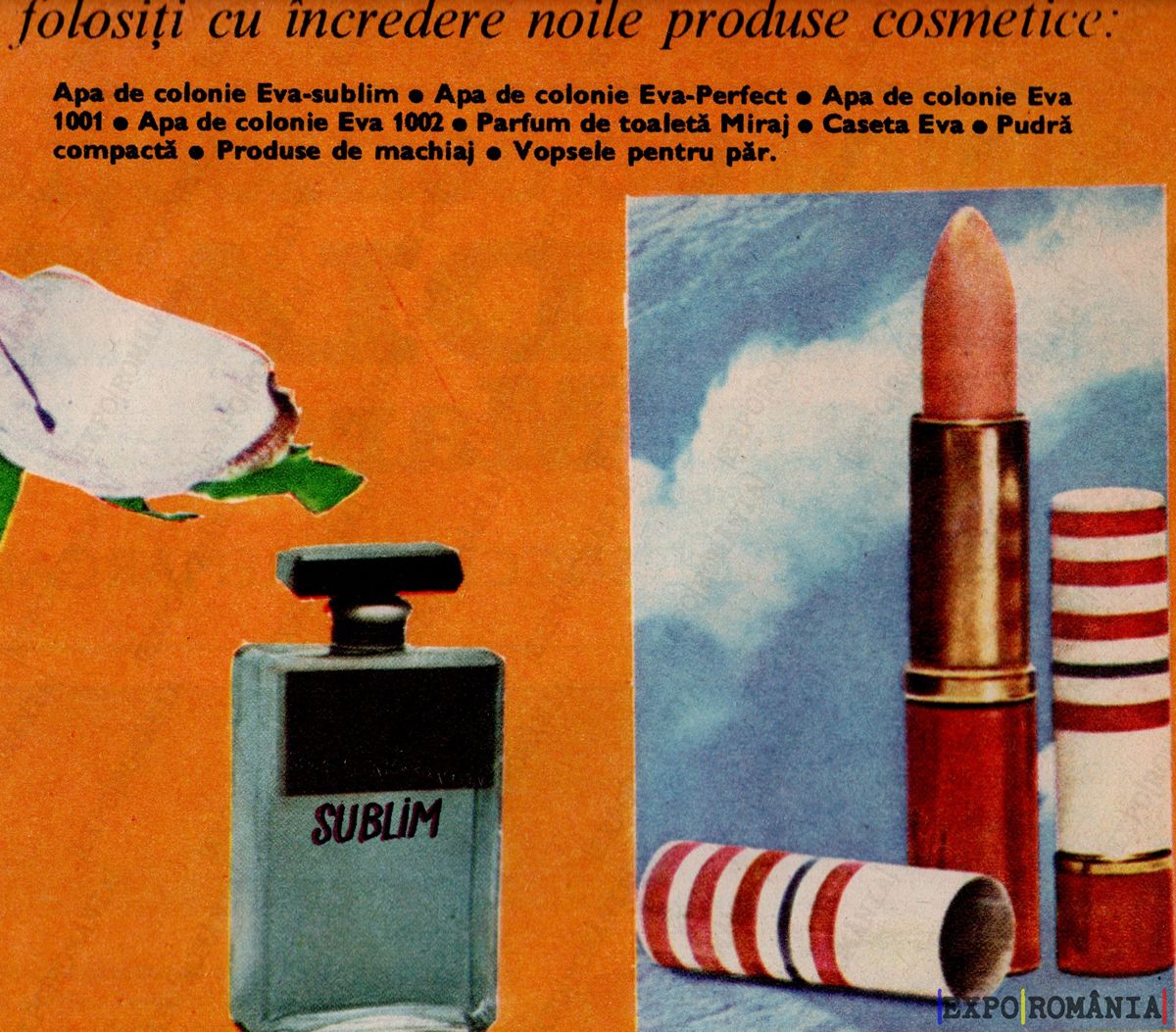 Apa de colonie Eva-sublim • Apa de colonie Eva-Perfect • Apa de colonie Eva 1001 • Apa de colonie Eva 1002 • Parfum de toaletă Miraș • Caseta Eva • Pudră compactă • Produse de machiaj • Vopsele pentru păr.