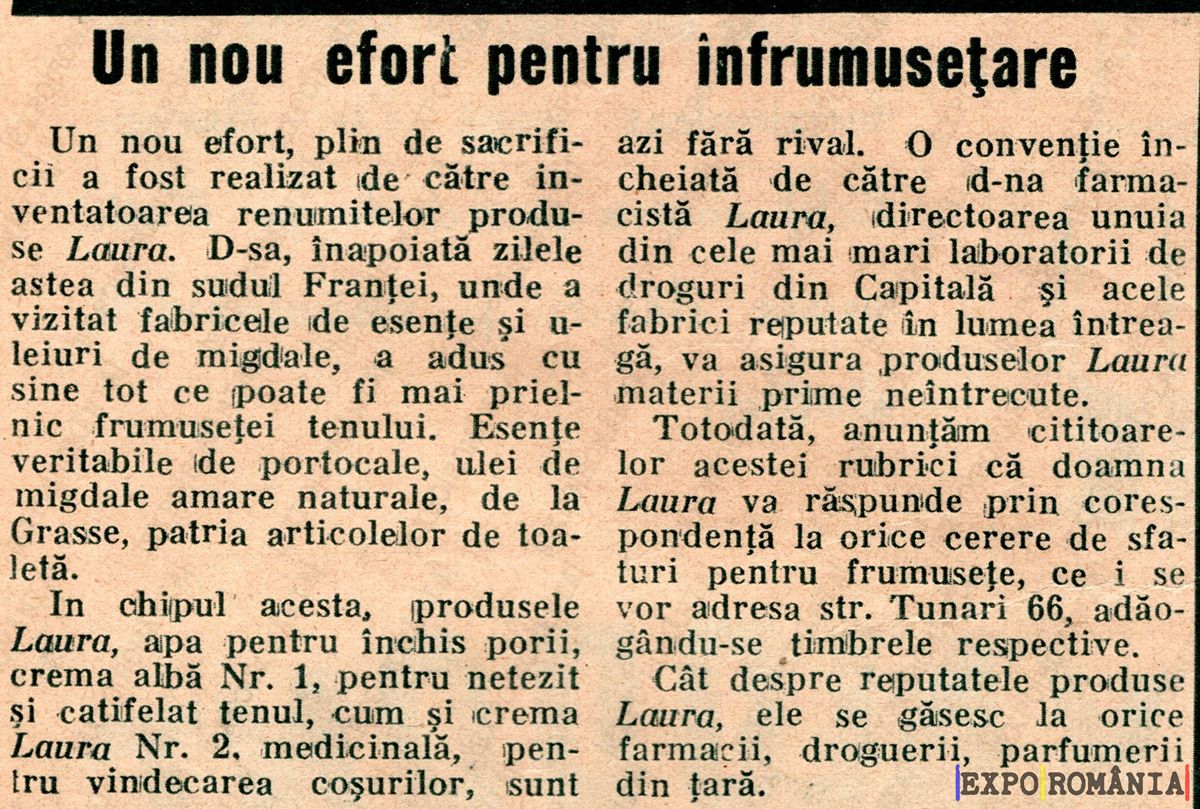 În chipul acesta, produsele Laura, apă pentru tenhii porii, crema alba Nr. 1, pentru neteziti si catifelat tenul, cum și crema Laura Nr. 2, dedicată vindecării coșurilor, sunt azi fără rival. O convenție încheiată de către d-na farmacistă Laura, directoarea uneia din cele mai mari laboratoare de droguri din Capitală, și aceste fabrici reputate în lumea întreagă, îi asigură produsele Laura materiile prime neachizitionate.