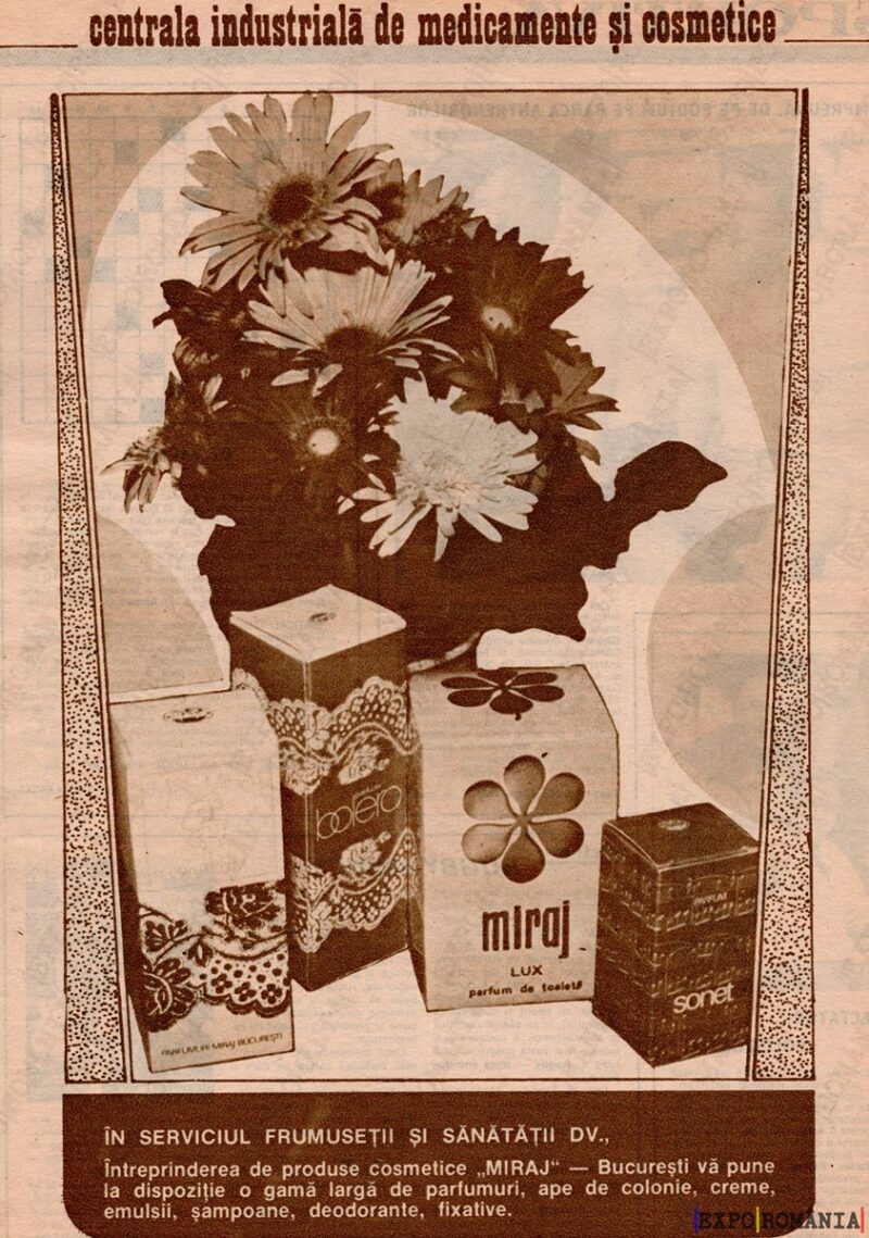 Întreprindere de produse cosmetice – MIRAJ – București vă pune la dispoziție o gamă largă de parfumuri, ape de colonie, creme, emulsii, șampoane, deodorante, laxative.