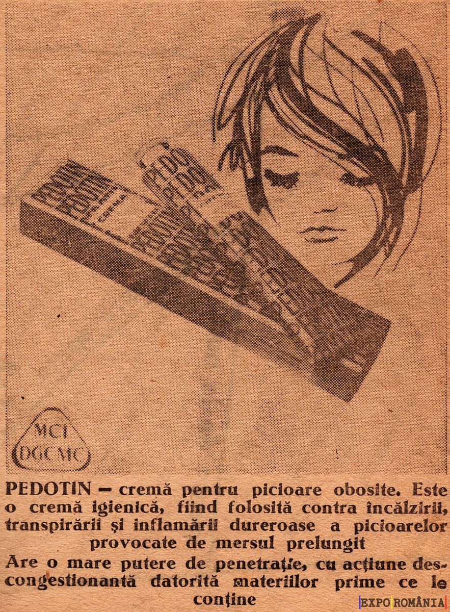 PEDOTIN – cremă pentru picioare obosite. Este o cremă igienică, fiind folosită contra încălzirii, transpirației și inflamațiilor dureroase a picioarelor provocate de mersul prelungit.