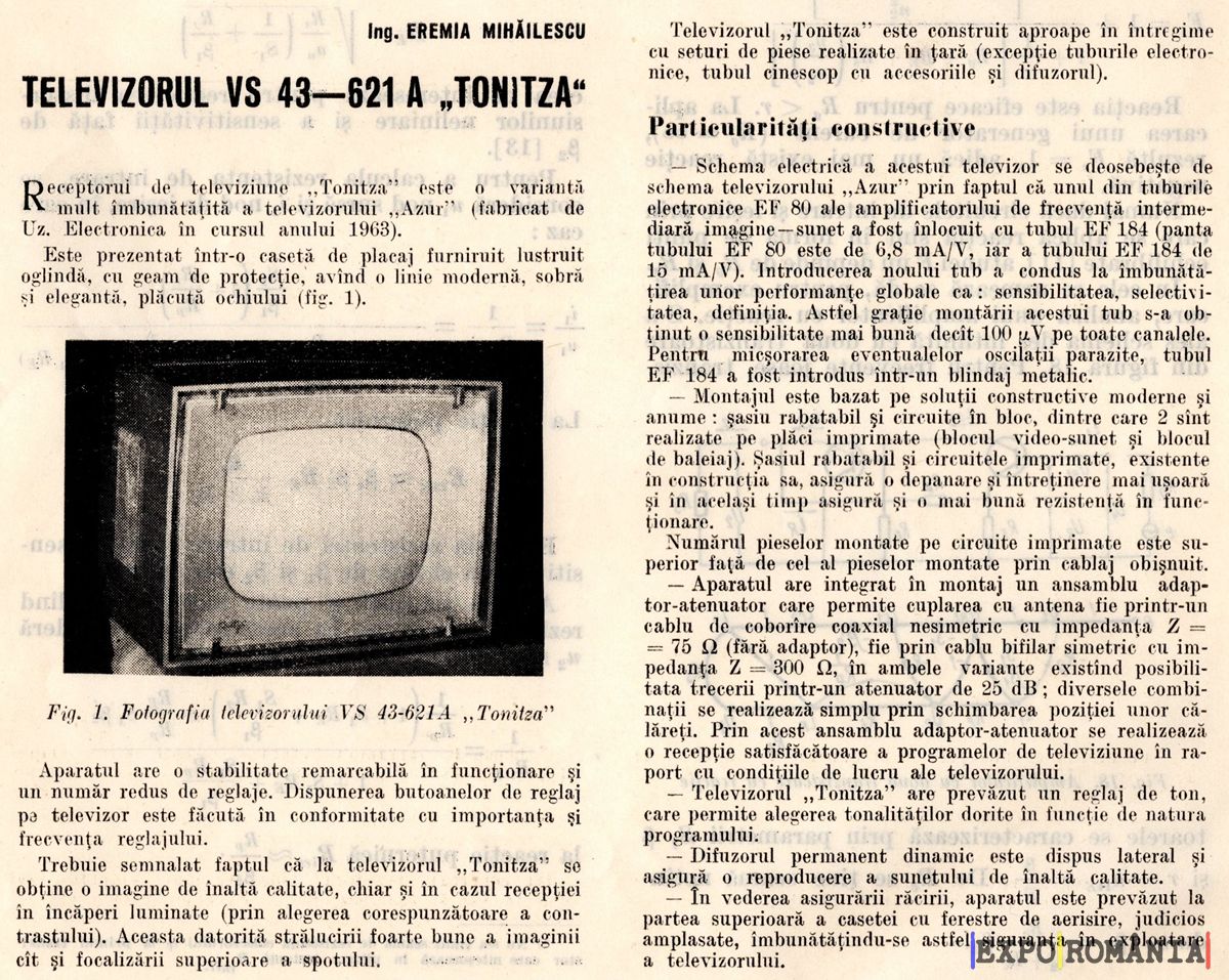 Televizorul Tonitza este construit aproape în întregime din seturi de piese realizate în fabrica (excepție butoanele electrice, tubul cinescop și ecranele de vizionare).