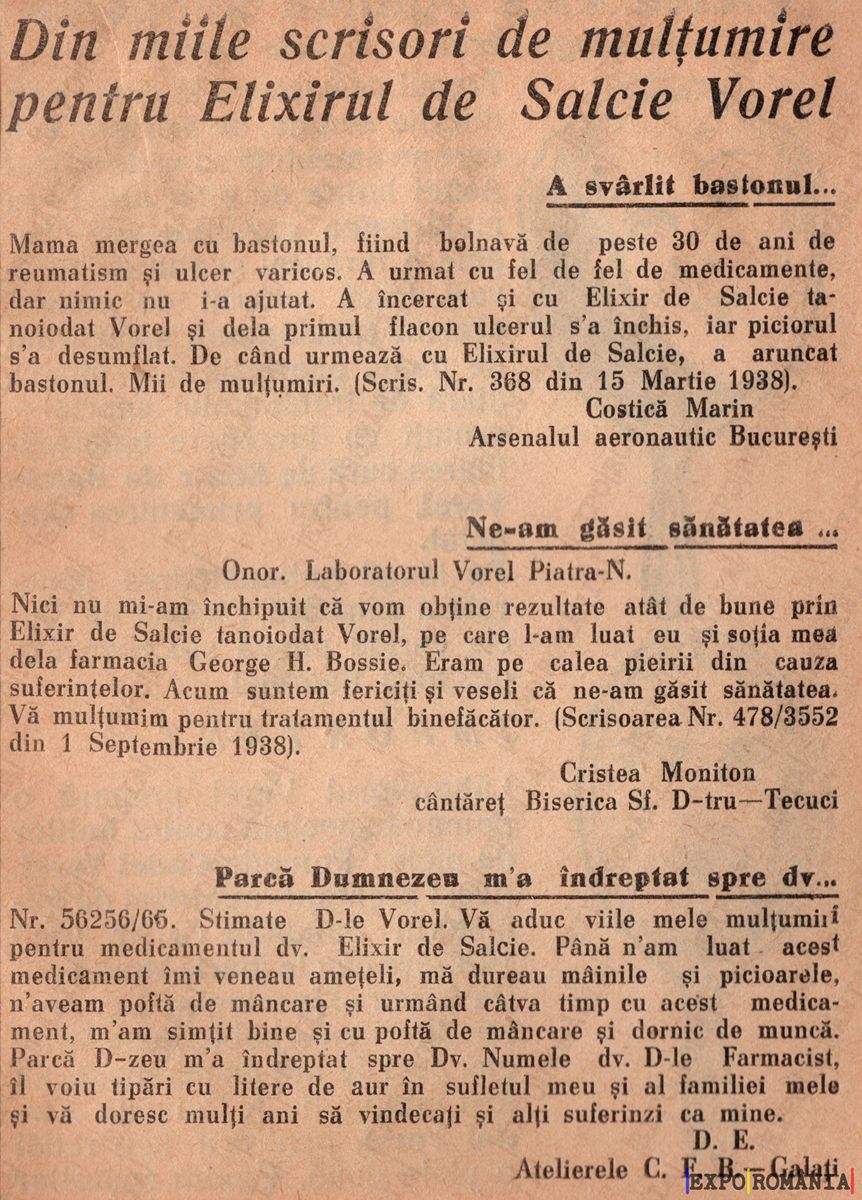 Mama mergea cu bastonul, fiind bolnavă de peste 30 de ani de reumatism și vârste variate. A încercat să fie fericită de altminteri și a zis: A încercat și cu Elixir de Salcie, în mod individual Vorel și dela primul flacon uleios s-a încheiat, iar piciorul s-a îmbunătățit. De aceea urmează un Elixir cu deja și bastonul. Mulțumiri. (Seria Nr. 368 din 15 Martie 1938.)