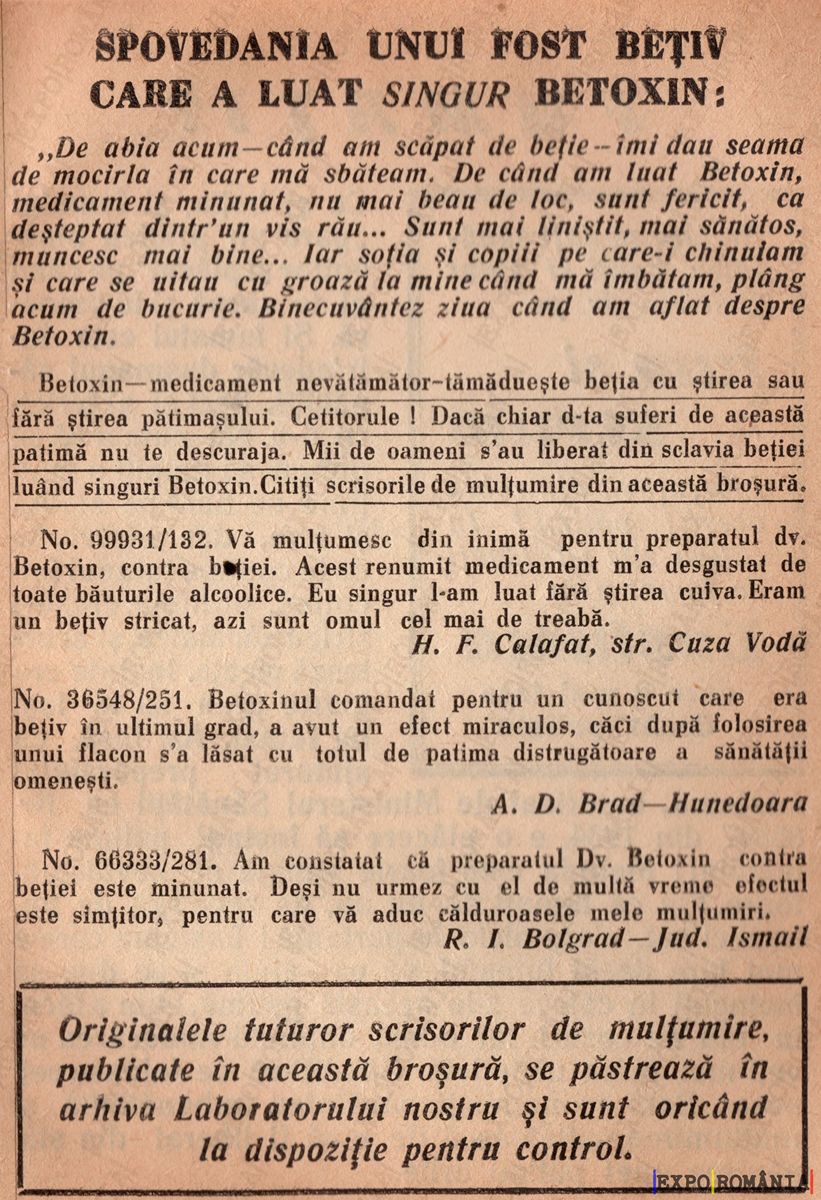 „De abia acum—când am scăpat de beţie—ini dau seamă de mocirla în care mă zbatem. De când am luat Betoxin, medicamentul minunat, nu mai beau decât seara, când, desăvârşit am vrut să fiu. Sunt mai liniştit, mai activ, muncesc mult mai bine… tar să fiu copil pe care-i chinuiam. Şi cerseşte să-mi aducă o mină când mai dădu-mi, bată-mi, am avut despre Betoxin.