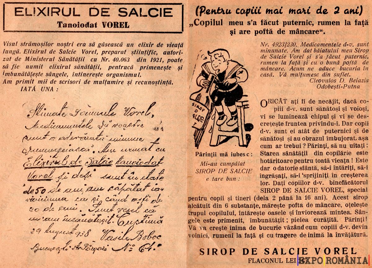 Visele strămoșilor noștri erau să găsească un elixir de viață lungă. Elixirul de Salcie Vorel, preparat științific, oarecum după o rețetă a Ministerului Sănătății din nr. 403 din 1921, poate să fie numit elixir al sănătății, primindse și ameliorândsimple, înlăturând organismul.