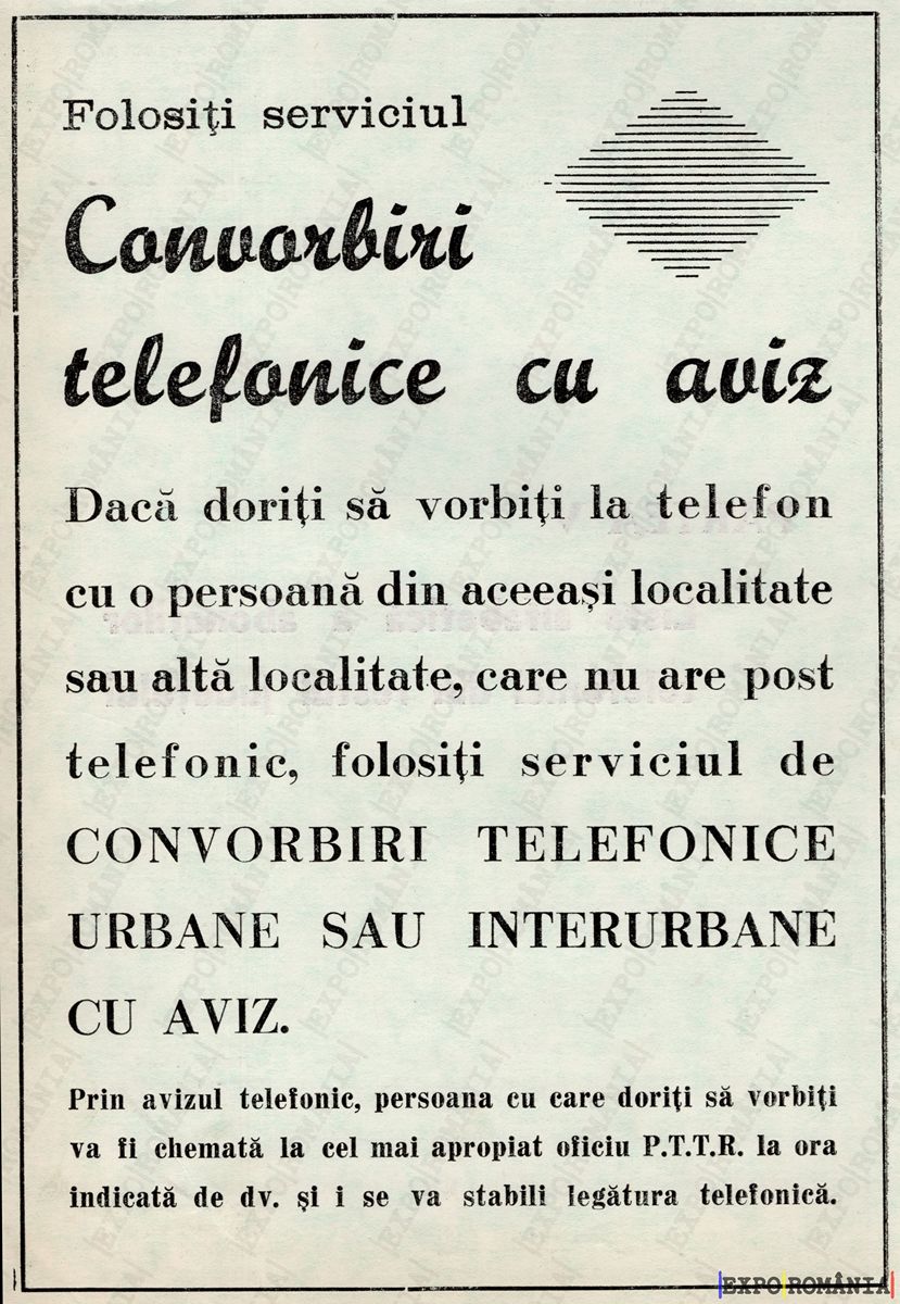 P rin avizul telefonic, persoana cu care doriți să vorbiți va fi chemată la cel mai apropiat oficiu P.T.T.R. la ora indicată de dvs. și să se stabilească legătura telefonică.