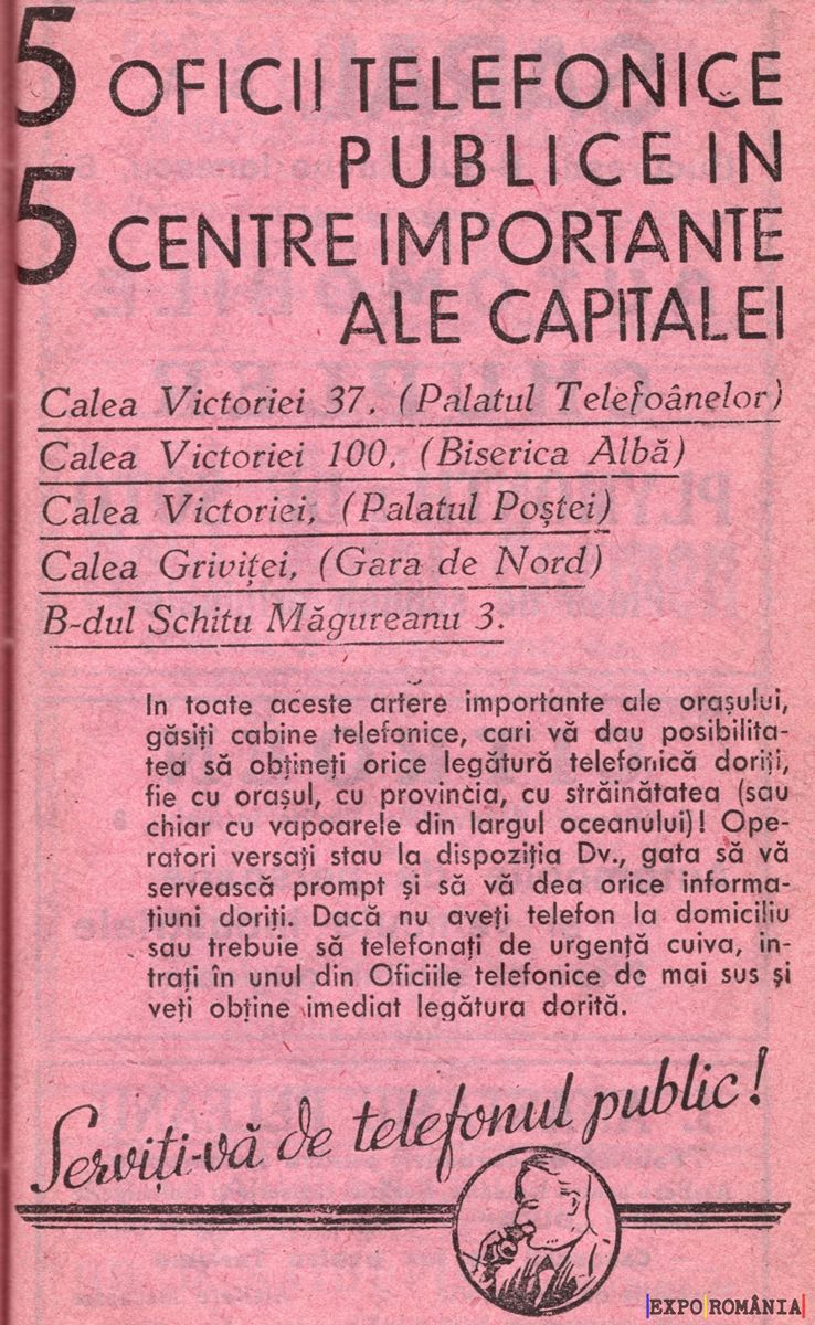 In toate aceste artere importante ale orașului, găsiți cabine telefonice, care vă dau posibilitatea să se obțină orice legătură telefonică dorită, cu orașul, cu provincia, cu străinătatea și chiar cu vapori în legătură acecotă!