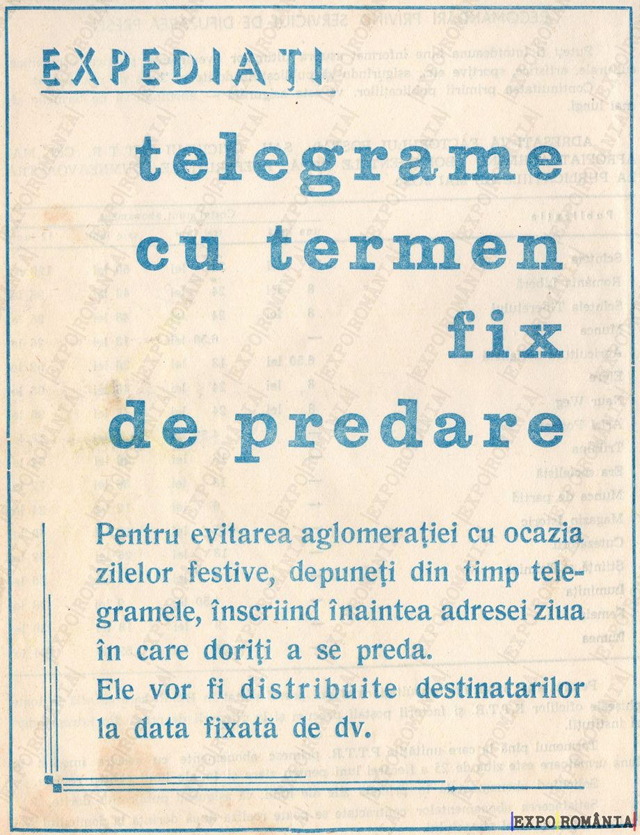 Pentru evitarea aglomerării cu ocazia zilelor festive, depuneți din timp telegramele, înscriind înaintea adresei ziua în care doriți a se preda.