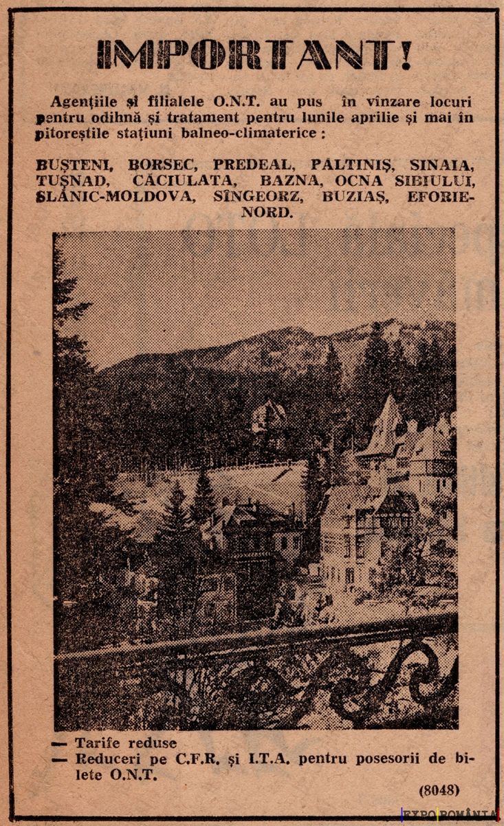 Agențiile și filialele O.N.T. au pus în vânzare locuri pentru odihnă și tratament pentru lunile aprilie și mai în pitorestele stațiuni balneo-climaterice: