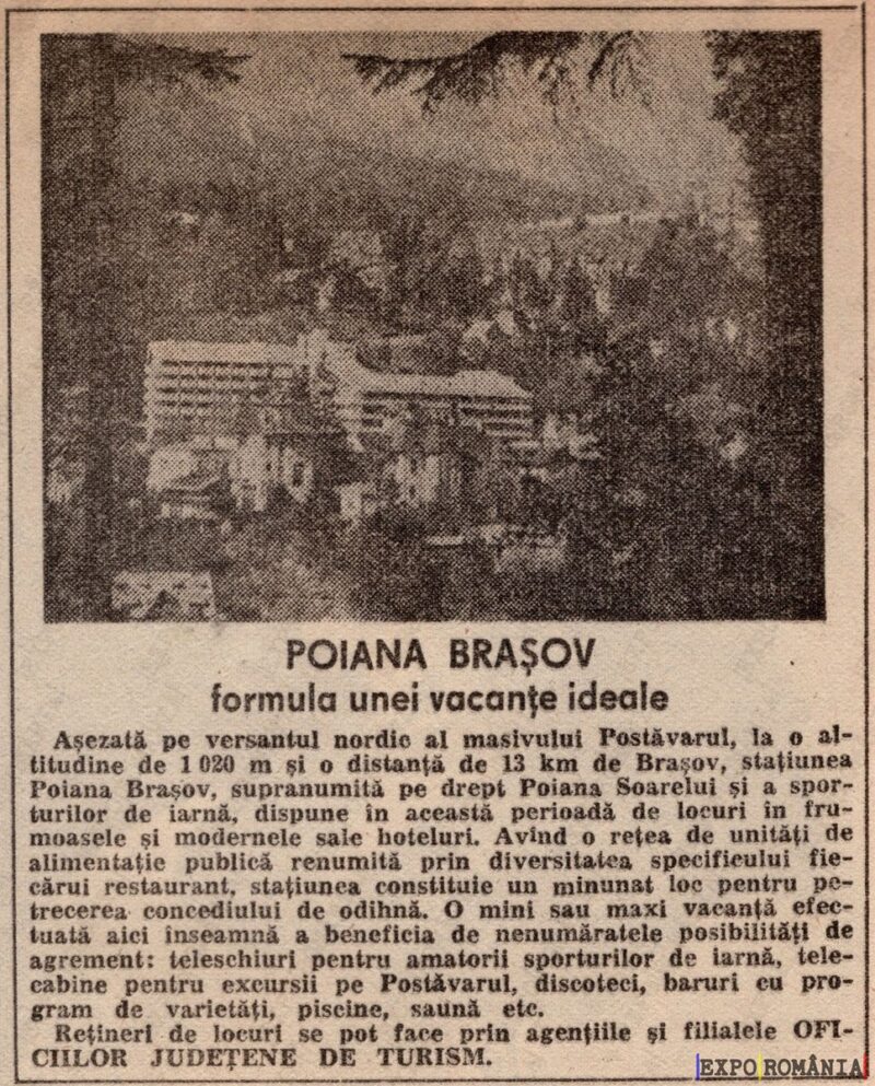 Așezată pe versantul nordic al masivului Postăvarul, la o altitudine de 1 020 m și o distanță de 13 km de Brașov, stațiunea Poiana Brașov, supranumită pe drept Poiana Soarelui și sparturilor de iarnă, dispune în această perioadă de locuri în tronsoanele și modernele sale hoteluri. Având o rețea de unități de alimentație publică, rămâne constituția minimă specificității pentru trecerea concediilor, de odihnă. O minune mai maxi vacanțe execută atât în beneficiul de namizării posibiltăți de activități recreative pentru amatorii sporturilor de iarnă, elemen.