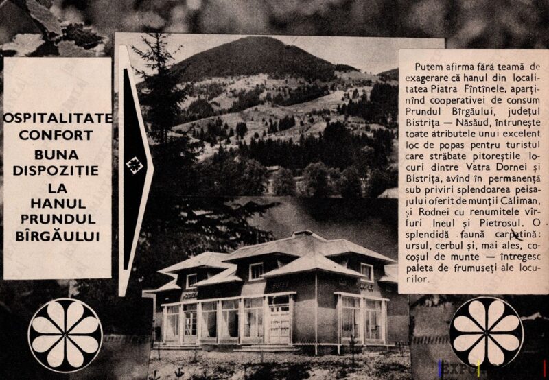 Putem afirma fără teamă de exagerare că hanul din localitate Piatra Fântânele, aparținând cooperativei de consum Prundul Bîrgăului, județul Bistrița – Năsăud, încercând toate inscripțiile pentru turiști de pe poarta pentru excursii în aria strictă pitorescilor zone Vatra Dornei și Bistrița, având în permanență un spus plin de optimism al Rodnei cu renumitele versuri ale Ineu și Pietrosul. O splendoare faună carpați-ului, erburi, etc, mai ales, ca o desăvârșire a frumuseții ale locurilor.
