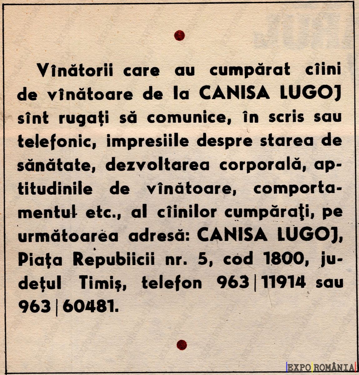 Vânătorii care au cumpărat câini de vânătoare de la CANISA LUGOJ sunt rugați să comunice, în scris sau telefonic, impresiile despre starea de sănătate, dezvoltarea corporală, aptitudinile de vânătoare, comportamentul etc., al câinilor cumpărați, pe următoarea adresă: CANISA LUGOJ, Piața Republicii nr. 5, cod 1800, județul Timiș, telefon 963 11914 sau 963 60481.